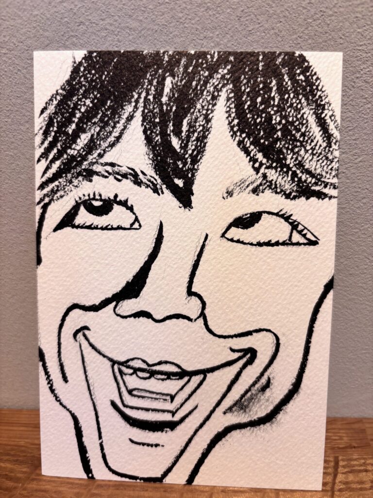 筆ペンは乾きが遅いことは知っていたので、ハガキの素材をいつもと違うものにしたのだが、そうするとこんどは凸凹にインクがうまく乗らない。ちょっぴり扱いが難しい。