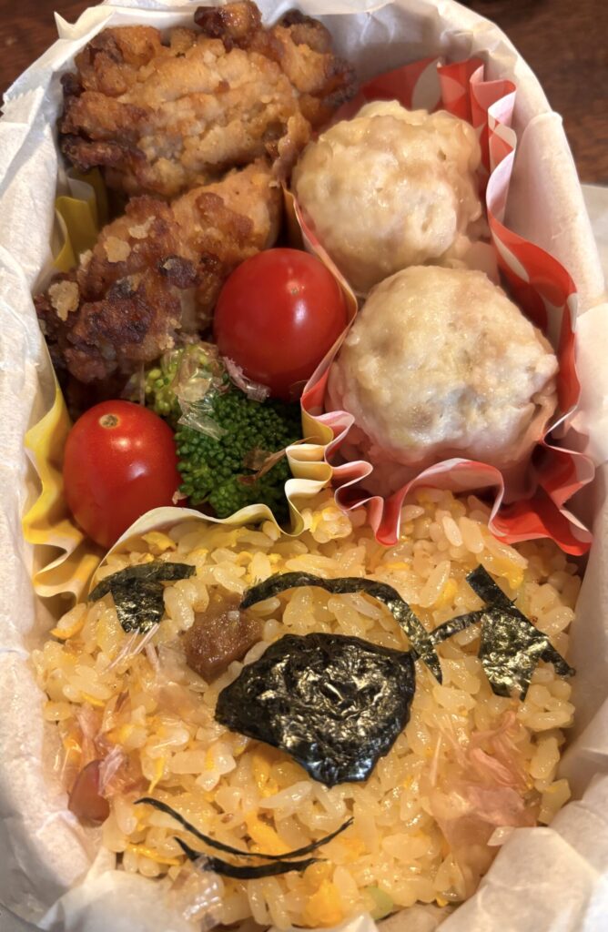 朝6時に起きて、はじめてのお弁当づくりに挑戦!チャーハン弁当を自分でデコってました。パパの分のお弁当も詰めてあげてました。そして、のこった唐揚げは彼女の胃袋におさまりました。