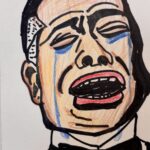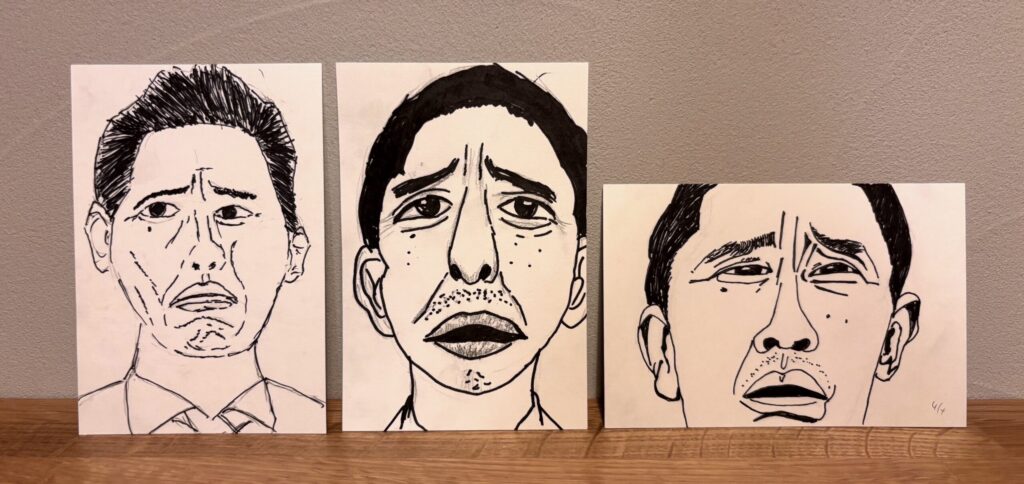 たとえば、私とあなたがマッキーで同じ人物の同じシーンを見ながら描いたとしよう。同じ素材、同じ道具をつかっても絶対に同じ絵にはならない。これは、家族や親子であってもそうだ。その証拠に、家族3人で同じモデル、「孤独のグルメ」の井之頭五郎(松重豊)の「腹が減った・・・」シーンを描いたのがこれだ。