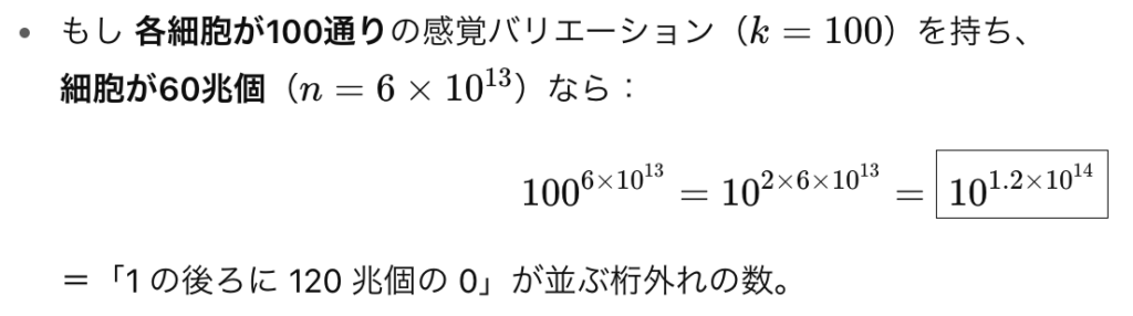 数学は決して得意ではないので、間違ってることに気づいた人がいたら教えていただけると嬉しいのだが、細胞のパターン数がどうであれ、わたしたちの身体は30兆個〜60兆個とも言われる細胞が存在するといわれている。それだけで、途方もない感覚=錯覚のバリエーションが存在することは、ご想像いただけると思う。