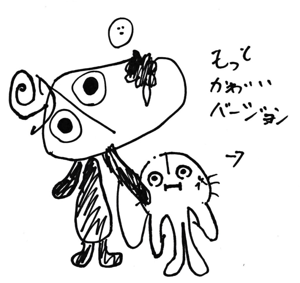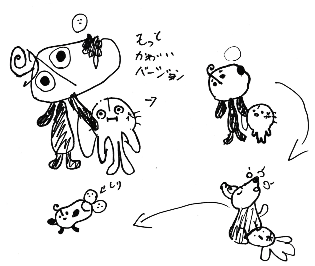 晩御飯の支度中に声かけられたので、最初は1だけ見て可愛い!って言っちゃったけど、あとで、よ〜く見ると、これ・・・抽象、具象いったりきたりしてるやんけ。
