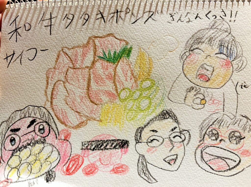 中でもこっちゃんは、「和牛タタキポン酢」が気に入ったようで、今回はそれをメインに据えて描いておりました。