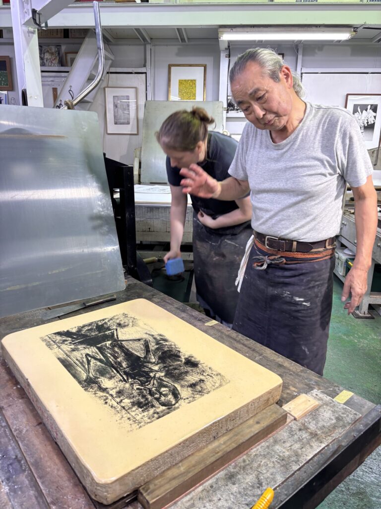写真に写っている摺師の尾崎正志さんは、利根山光人の義理の息子さんでもある。